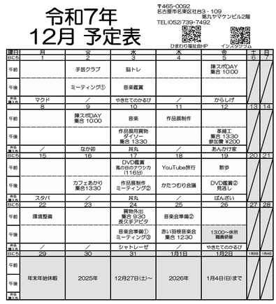 - 地域活動支援センターかたつむり🐌12月予定表🎄