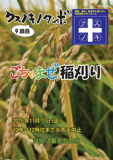 - くすの木から稲刈り体験の募集案内(参加費無料)です。開催は11月1日(土)10:00~12:00位を予定しています。※雨天時は中止となります。会場はくすの木(田んぼ)となります。ご参加頂く方には、事前申し込み頂ければ、昼食(豚汁、おにぎり予定)を提供致します。詳細、下記・...